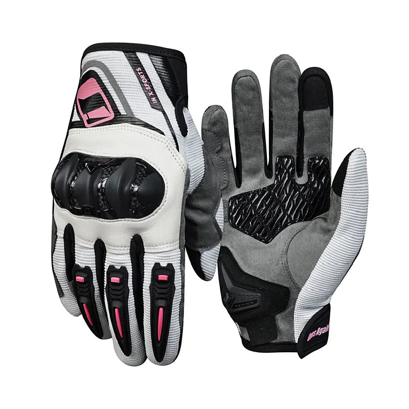 Los guantes MR02 para mujer son la elección ideal para el verano: ligeros, transpirables y pensados para ofrecer frescor incluso en días de calor. Incorporan silicona en el dedo, fibra de carbono para mayor protección y tejido polyester resistente. Además, su función touchscreen permite usar el móvil sin quitártelos. Perfectos para cualquier moto, incluso motocross.