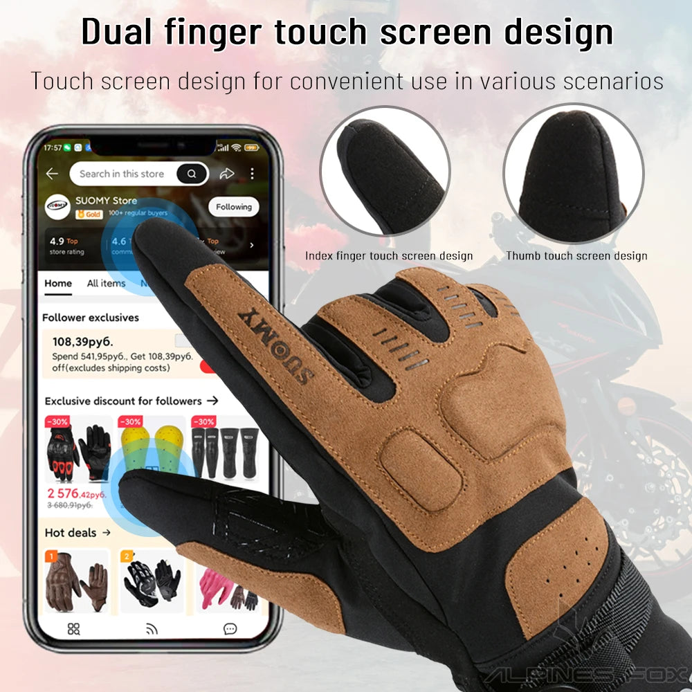 Guantes de moto de invierno fabricados en polyester, poliuretano y nylon, diseñados para mantener las manos calientes y secas en cualquier condición. Su cierre ajustable garantiza un ajuste perfecto, mientras que la membrana impermeable protege de la lluvia y la nieve. Además, son aptos para pantallas táctiles, permitiéndote usar GPS o móvil sin quitártelos. Cómodos y seguros para cada ruta invernal.