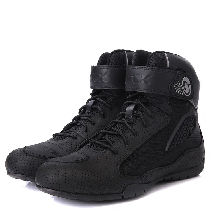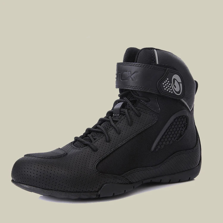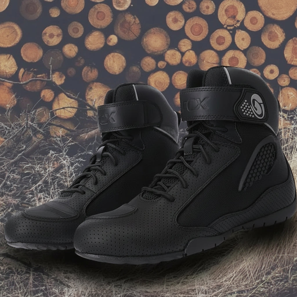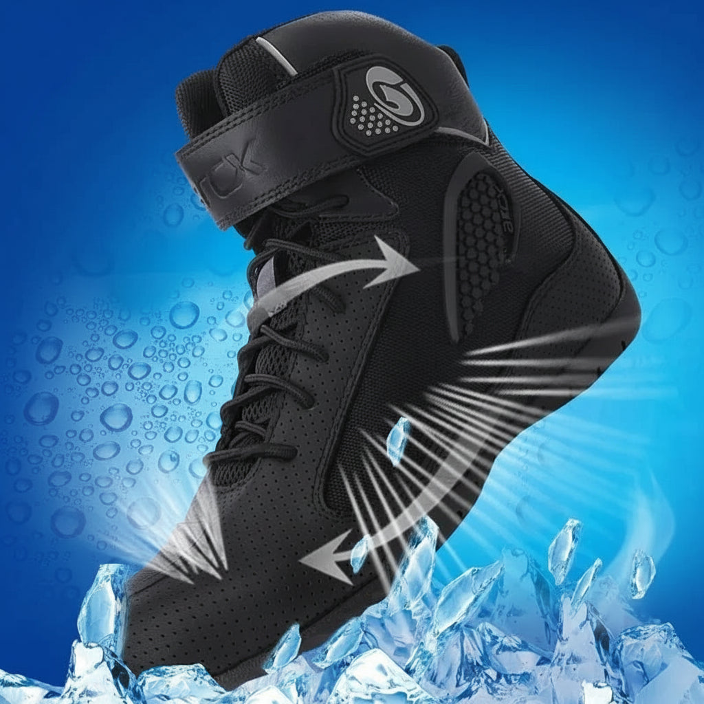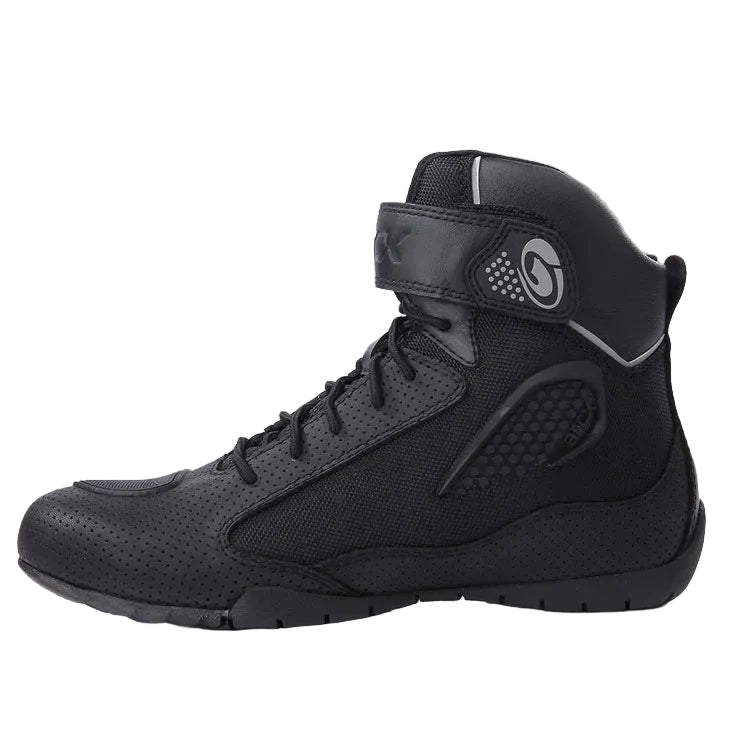 L60625 low-cut motorcycle boots, designed for urban riding, touring, and light off-road use year-round. Made of leather and nylon fabric with mesh panels, they offer excellent ventilation, lightness, and wear resistance. The non-slip, shock-absorbing rubber sole enhances grip and impact absorption, while the lace-up closure ensures a precise and stable fit while riding.