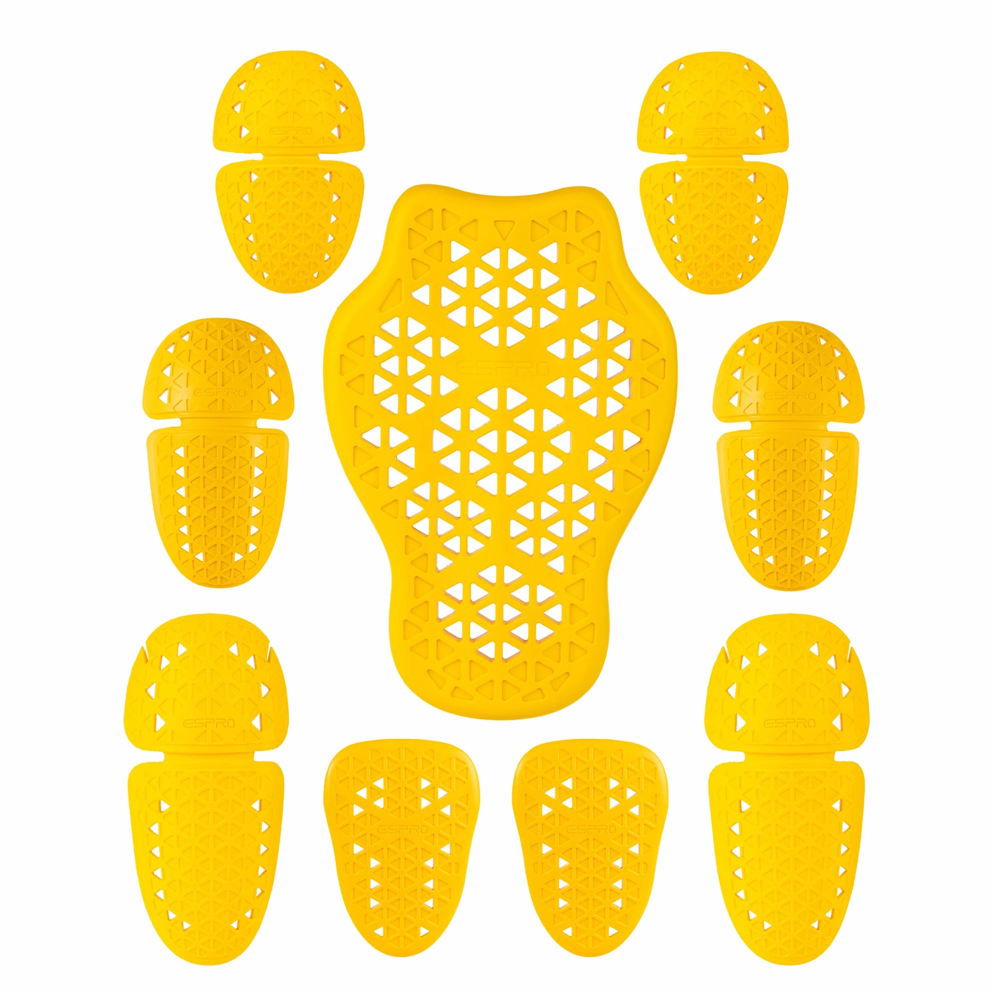 This PR002 set of protectors stands out for its high-density TPU (thermoplastic polyurethane) construction, offering CE2-certified impact absorption. Its ergonomic and ultra-thin design ensures discreet integration into motorcycle jackets or pants without sacrificing mobility. Thanks to its breathable and waterproof structure, it provides both comfort and safety for the shoulders, elbows, knees, and back.