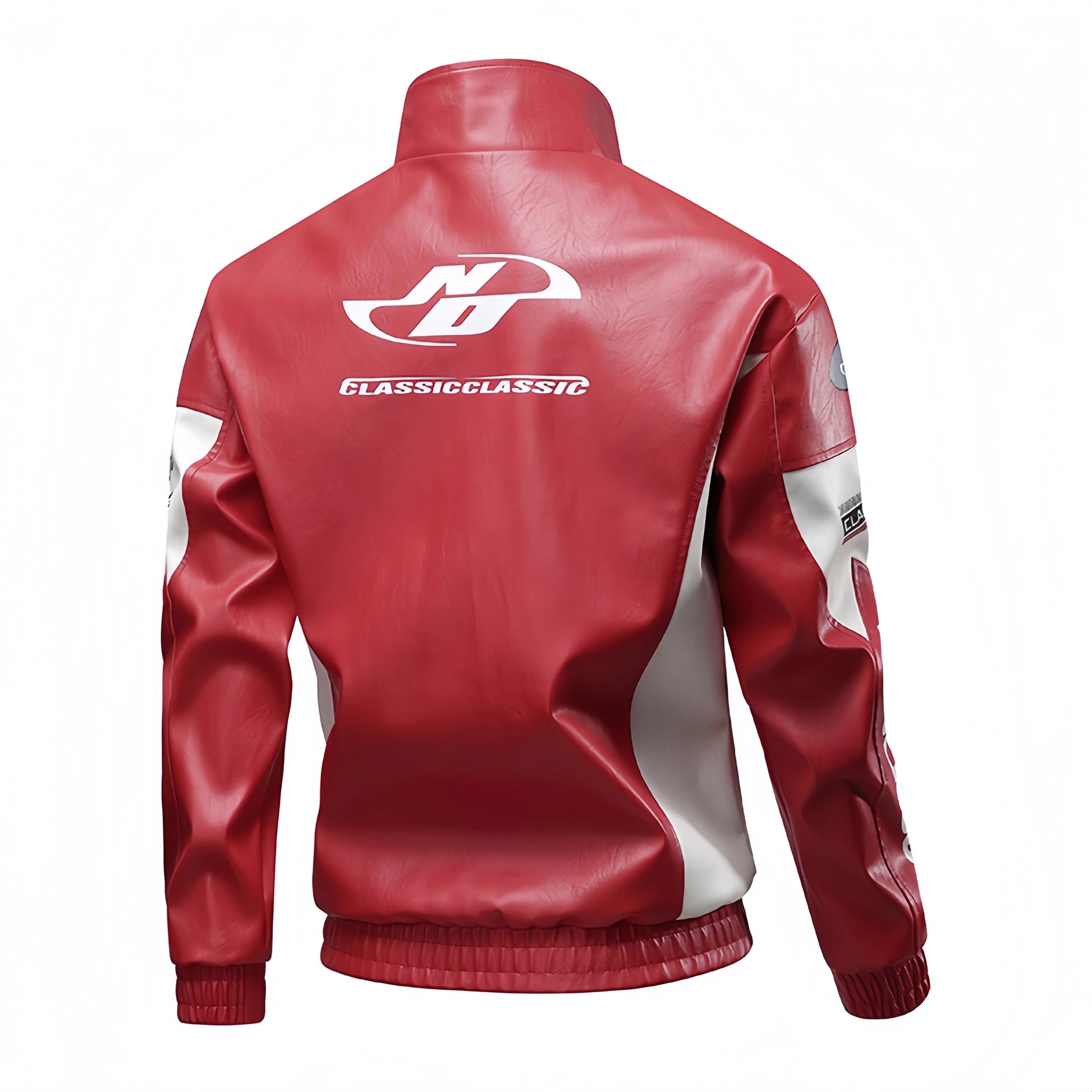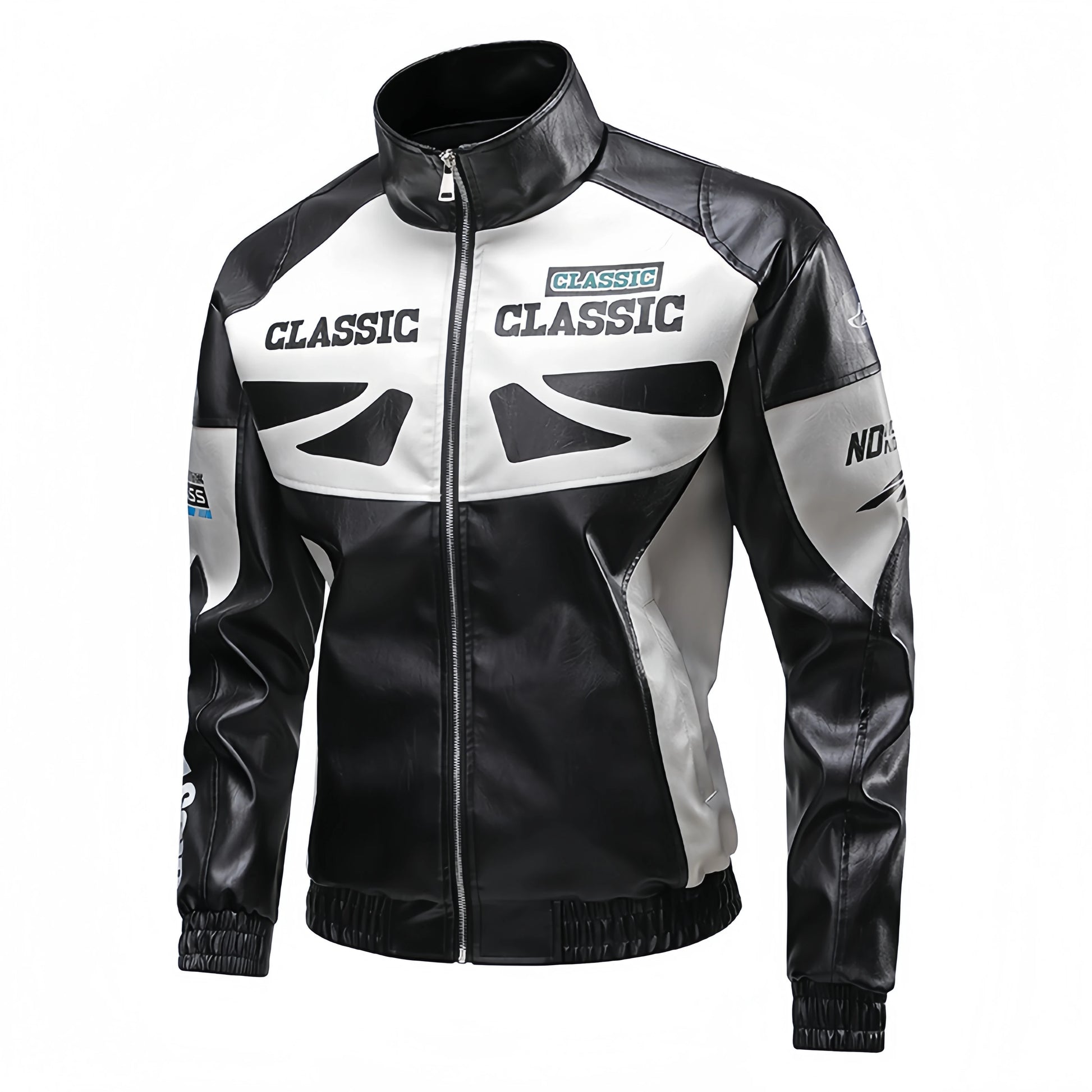 Jacket model A421699, designed to showcase biker style with a technological touch. Its leather-look exterior combines durable canvas fabric with a waterproof, windproof, and quick-drying finish, while the polyester and spandex lining provides comfort and freedom of movement. It includes cotton padding and a heated system for temperature regulation, featuring a unisex design with a regular fit and modern geometric patterns.