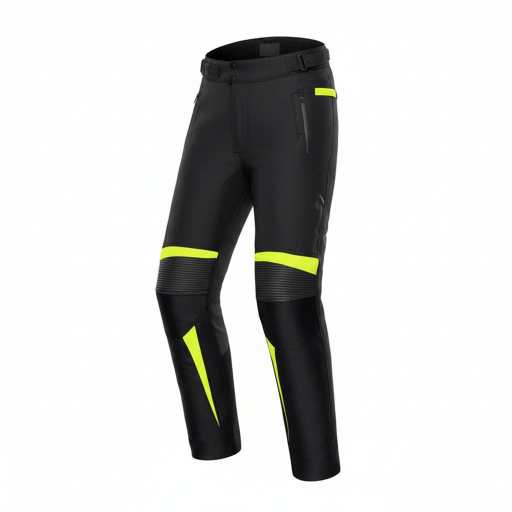 The MC1702P pants are designed primarily for touring. Made of polyester, they include knee and leg protectors. They feature an inner lining, making them suitable for both summer and winter wear. They are water-resistant and include reflective elements. The MC1702P pants are part of the MC1702S riding suit.