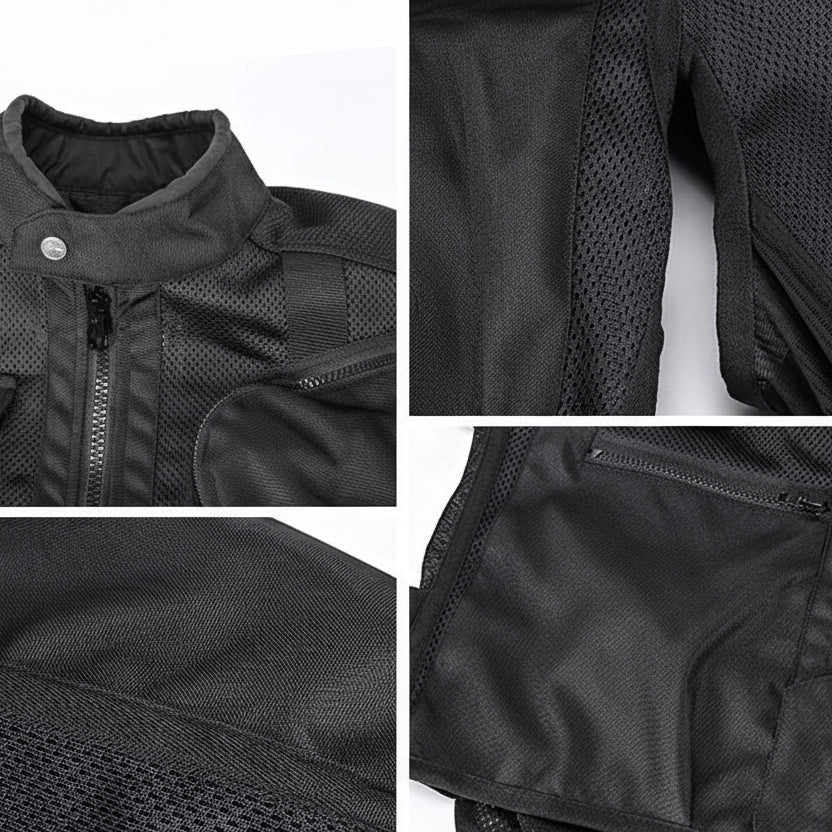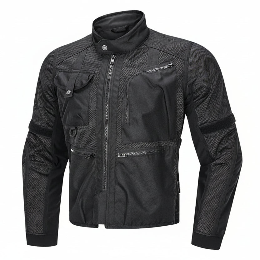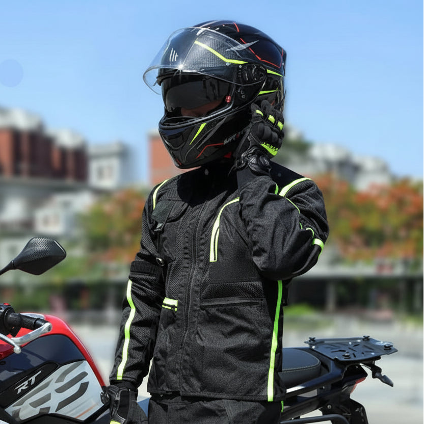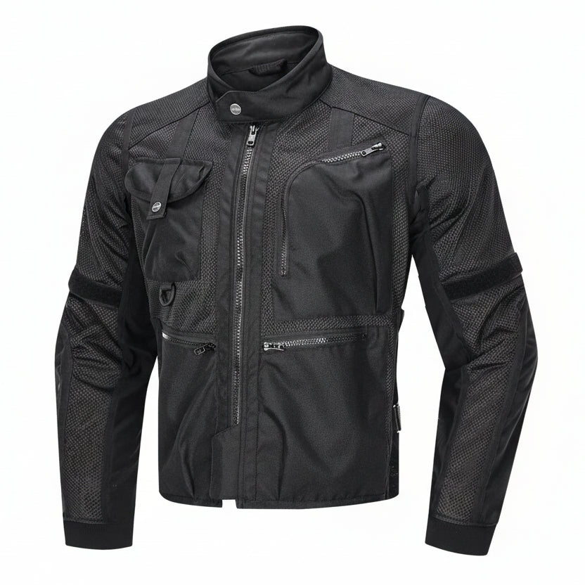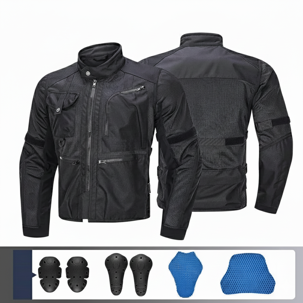 Adult unisex LY2009B motorcycle jacket, long cut, biker style, designed for outdoor motorcycle sports in summer. Made from Oxford fabric, polyester, and spandex, with a crew neck, it is lightweight, breathable, windproof, and waterproof, with a removable inner lining and plus sizes. It includes protection for sport bikes and is also suitable for outdoor activities.