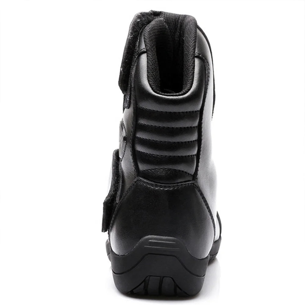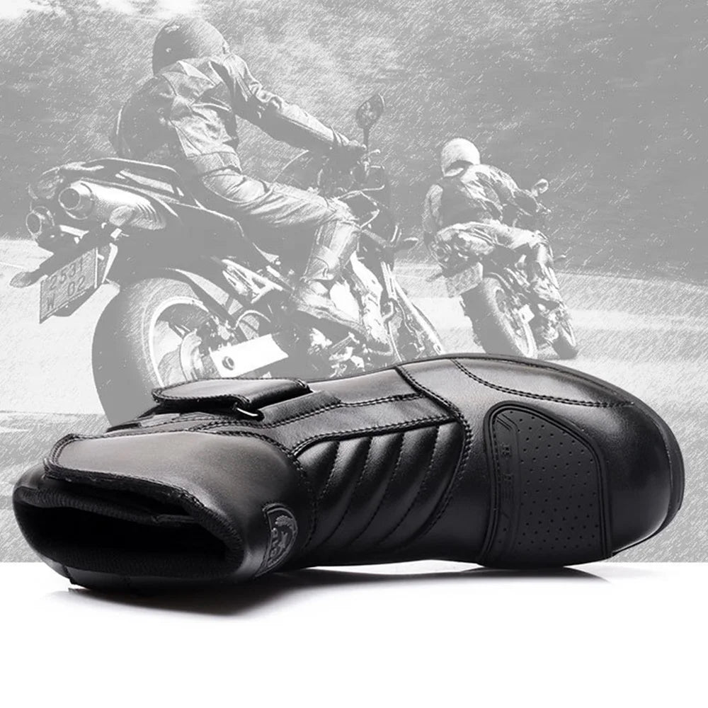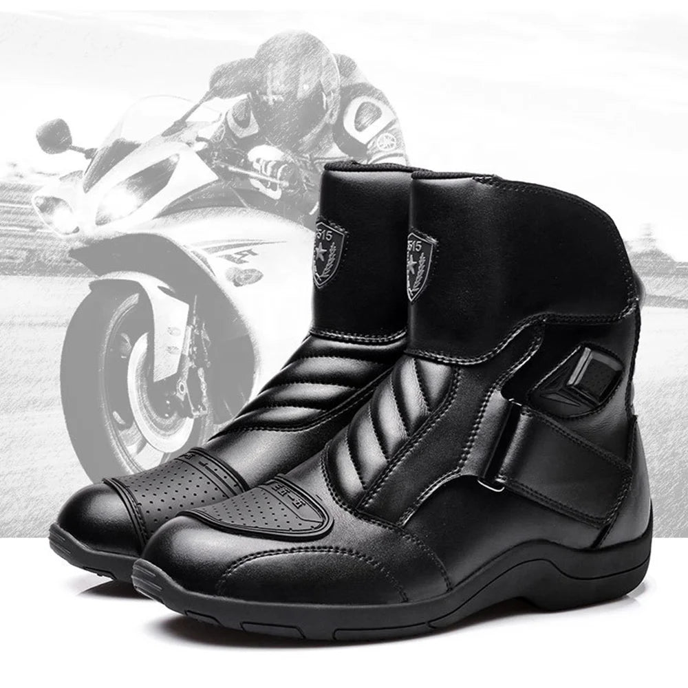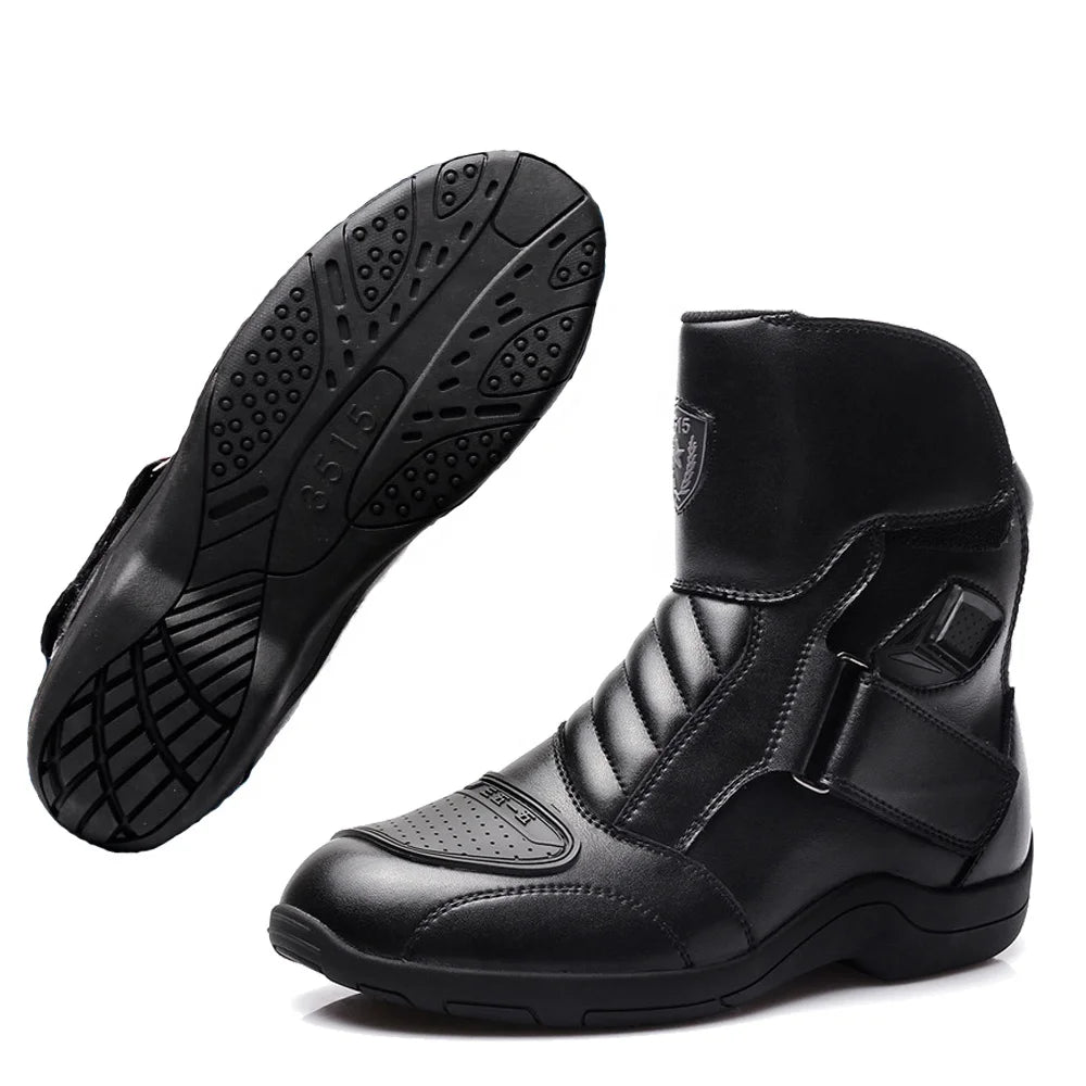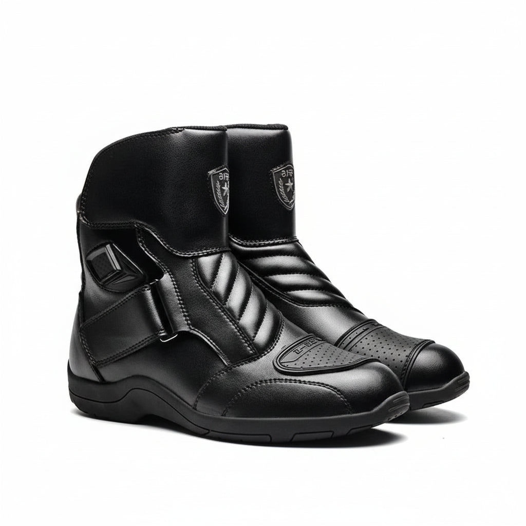 MT001 mid-calf motorcycle boots, designed for safe riding year-round. Made with leather, high-resistance polyurethane, and a breathable mesh lining. They offer wind protection, a non-slip rubber sole for maximum grip, shock absorption, and durability. Created for motorcyclists seeking comfort, safety, and performance in any season.