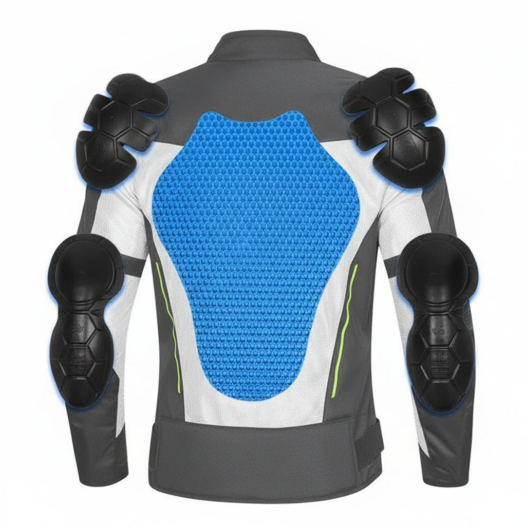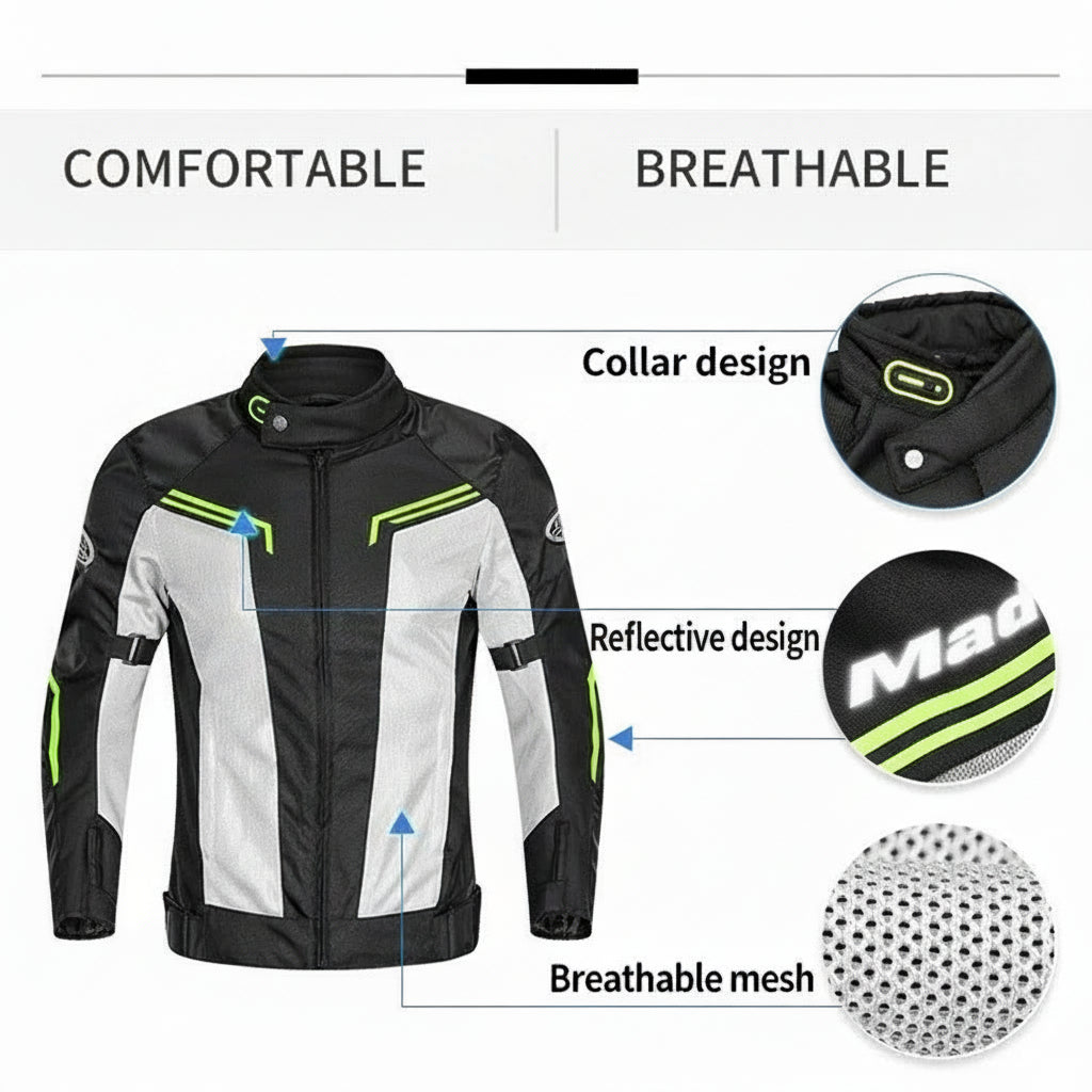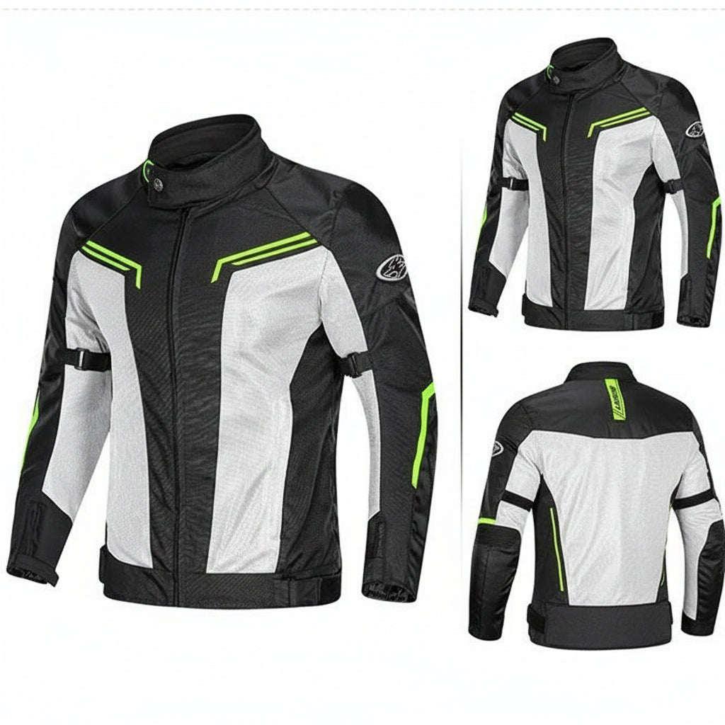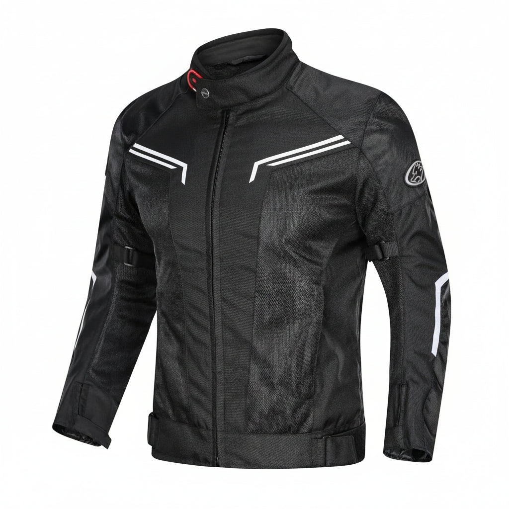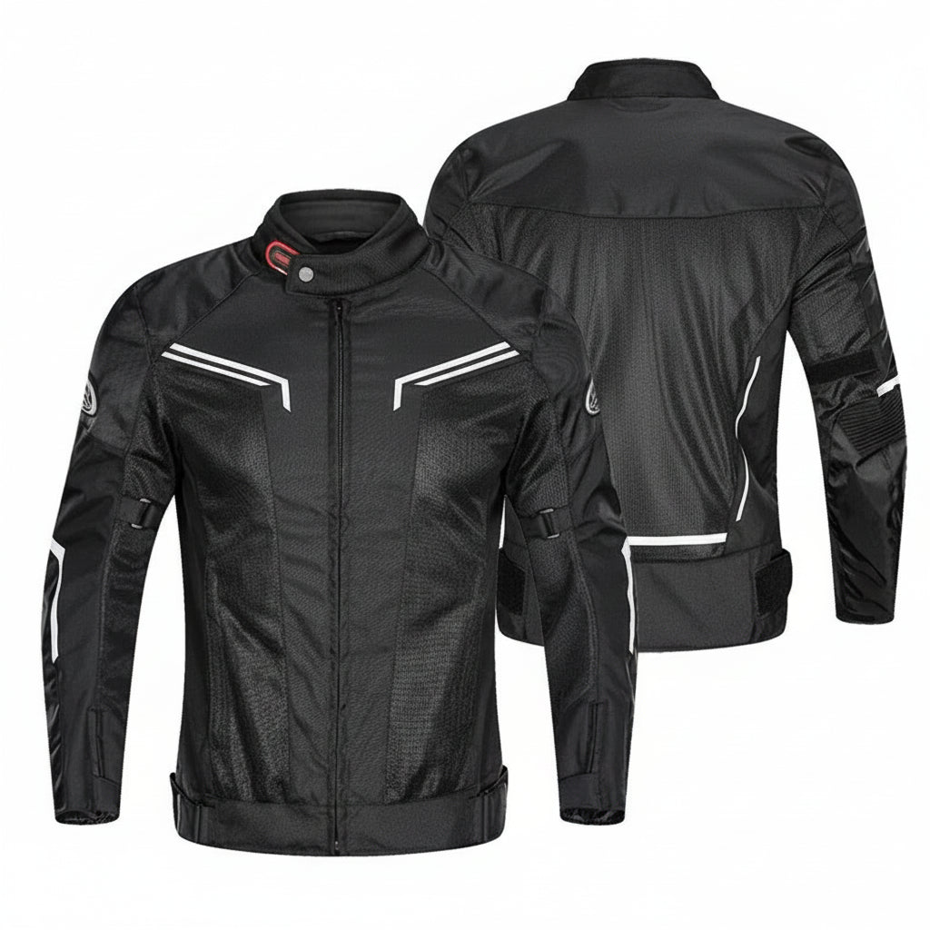 The LY803 unisex summer motorcycle jacket is designed for motorcycle and motocross use. Its durable Oxford fabric exterior is complemented by a breathable, waterproof, and stretchy polyester mesh lining. It features five removable EVA protectors in the back, shoulders, and elbows, adjustable cuffs, collar, and hem, and two external pockets.