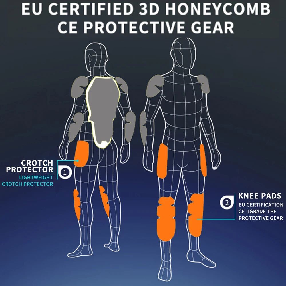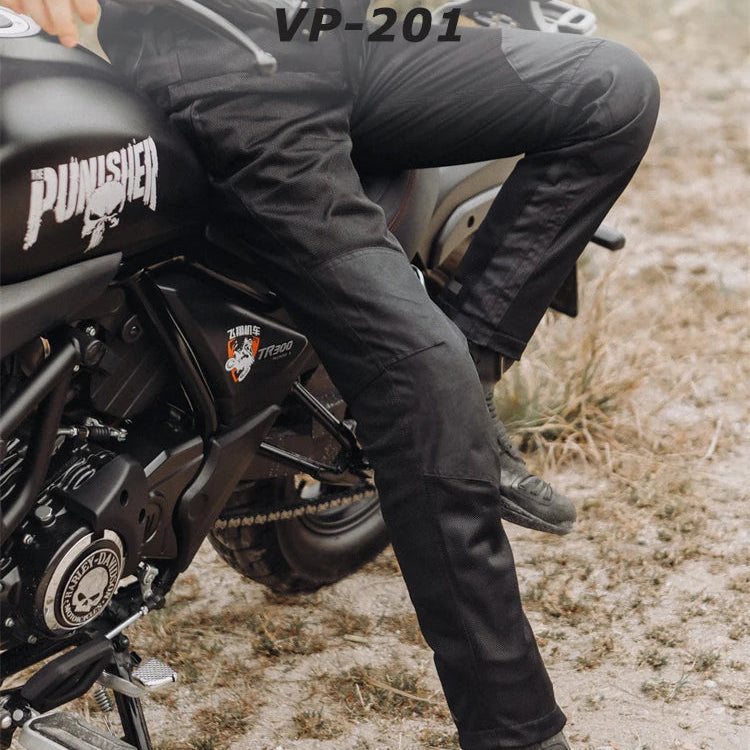 VP201 motorcycle pants are designed to combine protection on the road with comfort for everyday use. Their Oxford fabric, a blend of polyester, nylon, and spandex, is lightweight, stretchy, and durable, with a waterproof, windproof, and UV-resistant treatment for year-round wear. They feature removable CE-approved foam knee protectors and removable EVA armor, offering good safety for off-road riding, touring, or urban use.